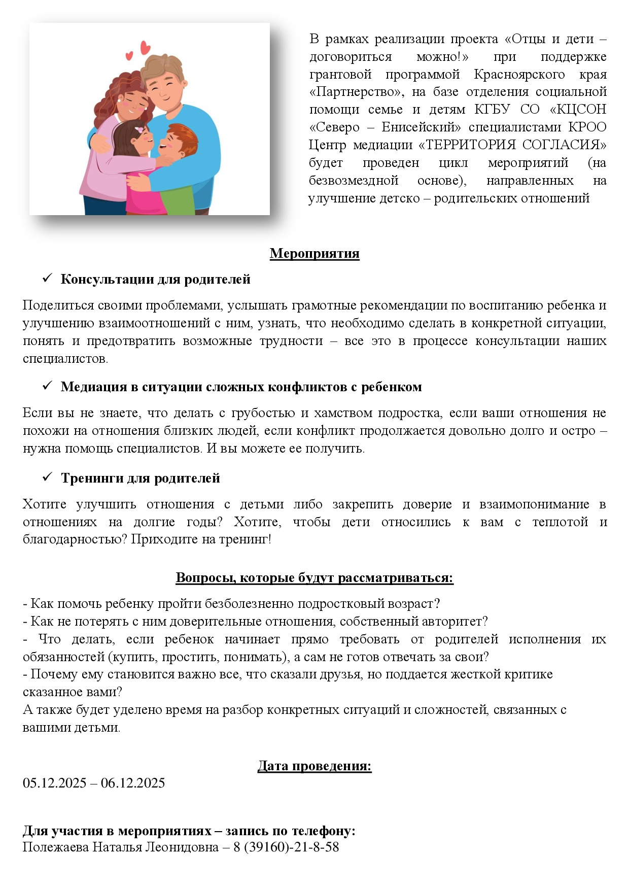 Отделение социальной помощи семье и детям КГБУ СО «КЦСОН «Северо – Енисейский» предлагает следующие социальные услуги на бесплатной основе: