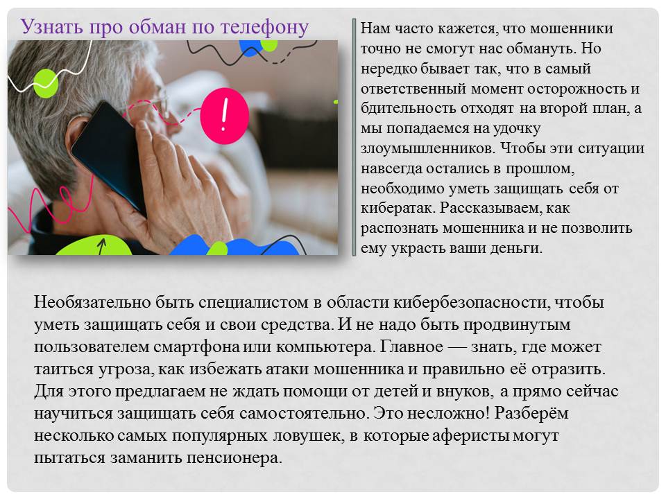 Ежедневно, жители Красноярского края подвергаются финансовому мошенничеству. Для получателей социальных услуг отделения социальной помощи семье и детям проведено профилактическое занятие, направленное на повышение информированности о распространенных способах мошенничества, в том числе и кибермошенничества. Участники занятия научились различать основные типы телефонного мошенничества, освоили приёмы быстрого выявления опасных ситуаций, получили рекомендации по предотвращению попыток обмана.
