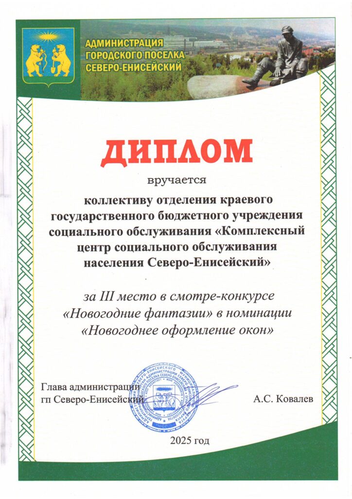 Отделение социальной помощи семье и детям участвовали в традиционном ежегодном смотре-конкурсе «Новогодние фантазии», организованном Администрацией Северо-Енисейского муниципального округа. В течение нескольких дней специалисты проявили настоящее творчество и терпение, создавая уникальные зимние украшения и рисунки на окнах учреждения: вырезали изящные снежинки, делали объемные фигуры и расписывали стекла красками, воплощая зимнюю сказку в жизнь. Итогом напряженной работы стало третье место в номинации «Новогоднее оформление окон». Коллектив отделения благодарит Администрацию округа за организацию конкурса и поздравляет всех коллег с успешным участием и новым достижением!